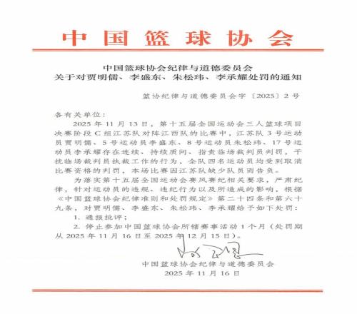 根據公告,2025年11月13日,第十五屆全國運動會三人籃球項目決賽階段C組江蘇隊對陣江西隊的比賽中,江蘇隊3號運動員賈明儒、5號運動員李盛東、8號運動員朱松瑋、17號運動員李承耀存在連續、持續質問、指責臨場裁判員判罰,干擾臨場裁判員執裁工作的行為,全隊四名運動員均受到取消比賽資格的判罰,本場比賽因江蘇隊缺少隊員而告負。為落實第十五屆全國運動會賽風賽紀相關要求,嚴肅紀律,針對運動員的違規、違紀行為以及所造成的影響,根據《中國籃球協會紀律準則和處罰規定》第二十四條和第六十九條,對賈明儒、李盛東、朱松瑋、李承耀給予如下處罰:1、通報批評;2、停止參加中國籃球協會所轄賽事活動1個月(處罰期從2025年11月16日至2025年12月15日)。